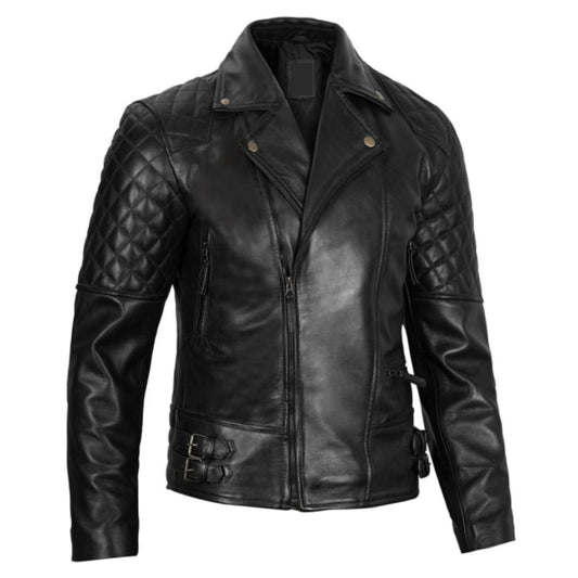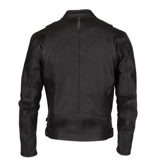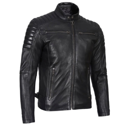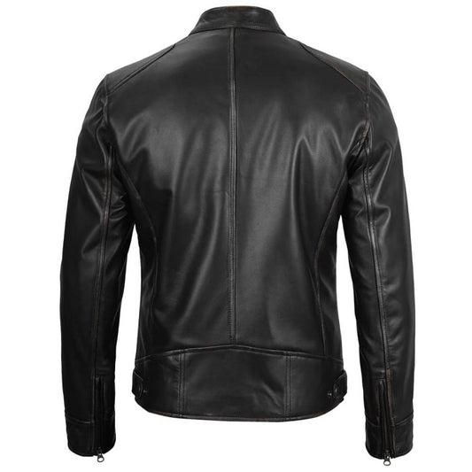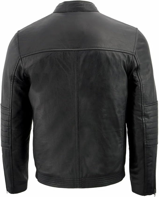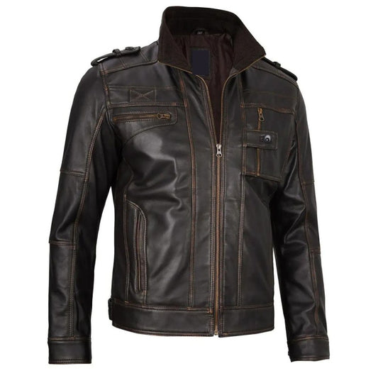 Black Motorcycle Leather Jacket with Hood & Stand Collar