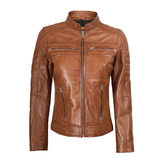 Carrie Women's Tan Cafe Racer Leather Jacket